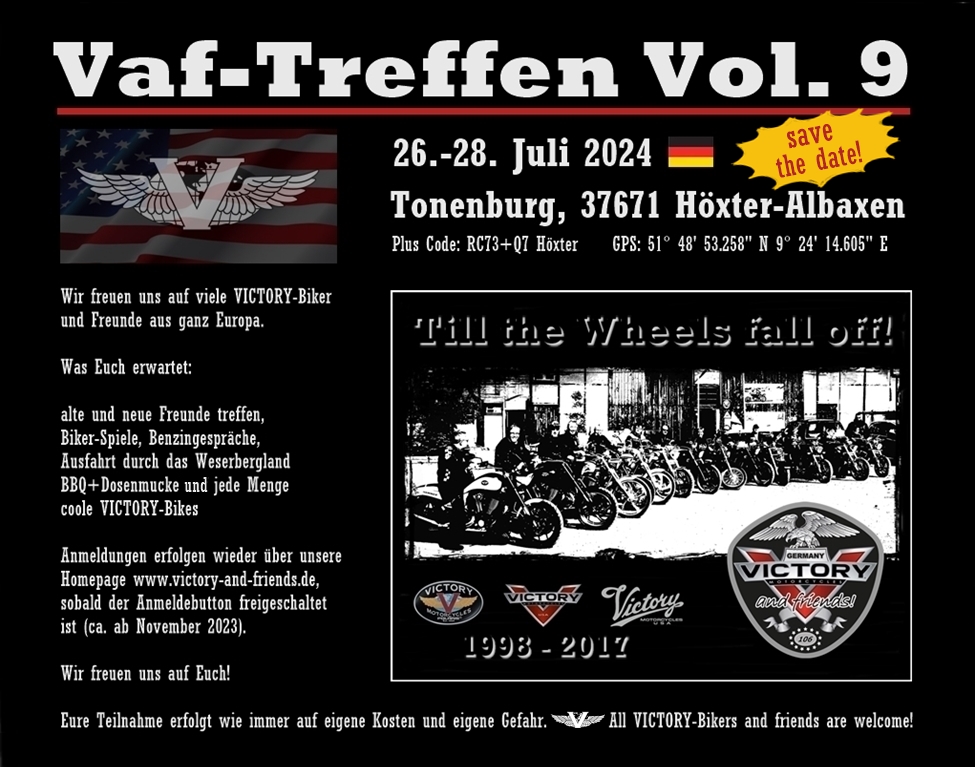 Zur Deckung unserer Kosten und Auslagen benötigen wir eine Eventpauschale in Höhe von 30,00 Euro je teilnehmender Person, die vorab nach der Anmeldung/Registration auf das von uns genannte Konto überwiesen werden muss. Diese beinhaltet die Kosten für DJ, Preise und Pokale, etc., ggf. erforderlichen Eintritt und Verpflegung während der Ausfahrt.