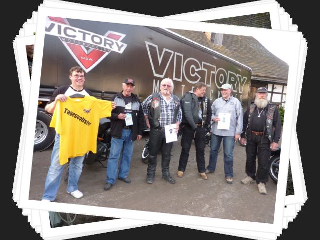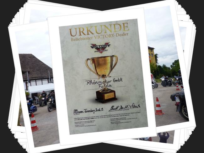 Erstmals in diesem Jahr konnten alle VICTORY-Biker den beliebtesten VICTORY-Dealer 2013 wählen. Dabei wurden die 4 Kategorien Freundlichkeit, Qualität der Werkstattleistungen, Termintreue und die Angebotsvielfalt bewertet. Diese Wahl konnte die Firma Rhönmotor knapp vor der Firma Kleinemeier Motorrad für sich entscheiden und erhielt hierfür unsere VICTORY and friends! - Urkunde für den beliebtesten VICTORY-Dealer 2013 ausgehändigt.
