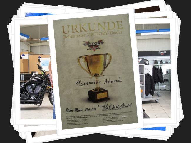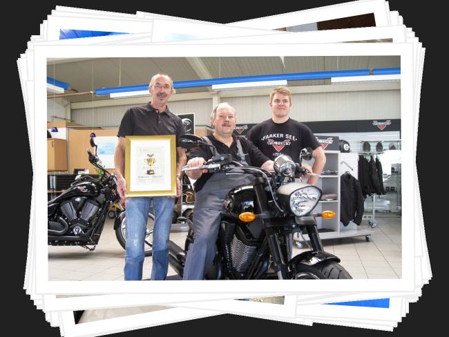 Die Wahl zum beliebtesten VICTORY-Dealer 2014 ging wieder einmal denkbar knapp aus. So konnte sich dieses Jahr die Fa. Kleinemeier (Mill´s County Motorcycles) knapp vor der Fa. Rhönmotor behaupten. Der Pokal für die Wahl des schönsten VICTORY-Bikes ging dieses Jahr nach England; ebenso unser LMAA-Pokal für das lauteste Bike. Die Gewinner vom Speed-Contest (Der Langsamste gewinnt!) und Bullriding-Wettbewerb erhielten jeweils einen Pokal und einen 100-Euro-Gutschein.