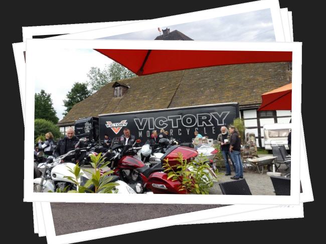 Und nachdem der Wettergott uns in den letzten Jahren nahezu im Stich gelassen hatte, konnten wir dieses Mal eine Trendwende verzeichnen. Unser 4. VICTORY and friends! - Treffen war das erste Treffen seit 2011, an dem das Wetter nicht schlechter war, als im Vorjahr! Die Stimmung war entsprechend gut. Trotz der wieder mal schlechten Prognosen für dieses Wochenende haben sich Viele nicht davon abhalten lassen, an Europa´s größtem VICTORY and friends! - Treffen teilzunehmen! Und es hat sich gelohnt, denn bei meist trockenem Wetter konnten wir insgesamt 93 VICTORY-Biker aus ganz Europa bei uns begrüßen und haben damit die Teilnehmerzahl aus dem letzten Jahr wieder mal getoppt, auch wenn wir unser Ziel nicht erreicht haben, dieses Jahr die Marke 100 zu knacken. So haben wir nun ein erstes Ziel für´s nächste Mal, wenn es wieder heißt: VICTORY and friends! - Treffen Vol. 5!